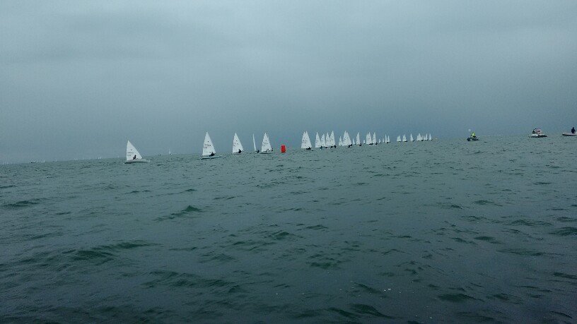 Die Qualifikation: In 8 Wettfahrten wird entschieden, wer im Finale in der Gold-Fleet um Medaillen kämpfen kann und wer in der Silber, der Bronze und der Emeralds-Fleet um die restlichen Platzierungen segeln wird. Im Bild der Start zur 1. Qualifikationswettfahrt.